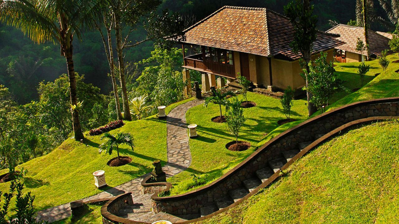 Manicured lawns carpeting rolling hills with beautiful stone paths and statues, covered with a hint of moss, blend seamlessly into the nature that abounds. Beautiful raised villas, dotted spaciously across the 5 hectares of hillside gardens provide sufficient space for absolute privacy. Each villa with magnificent views from wide windows and spacious verandahs provide a sense of space, quiet and peace. This is the place where heaven and earth collide. In the silence, birds and frogs find their voice, and it is a welcome melody. The gentle sound of the resorts natural waterfall softly caresses every moment.